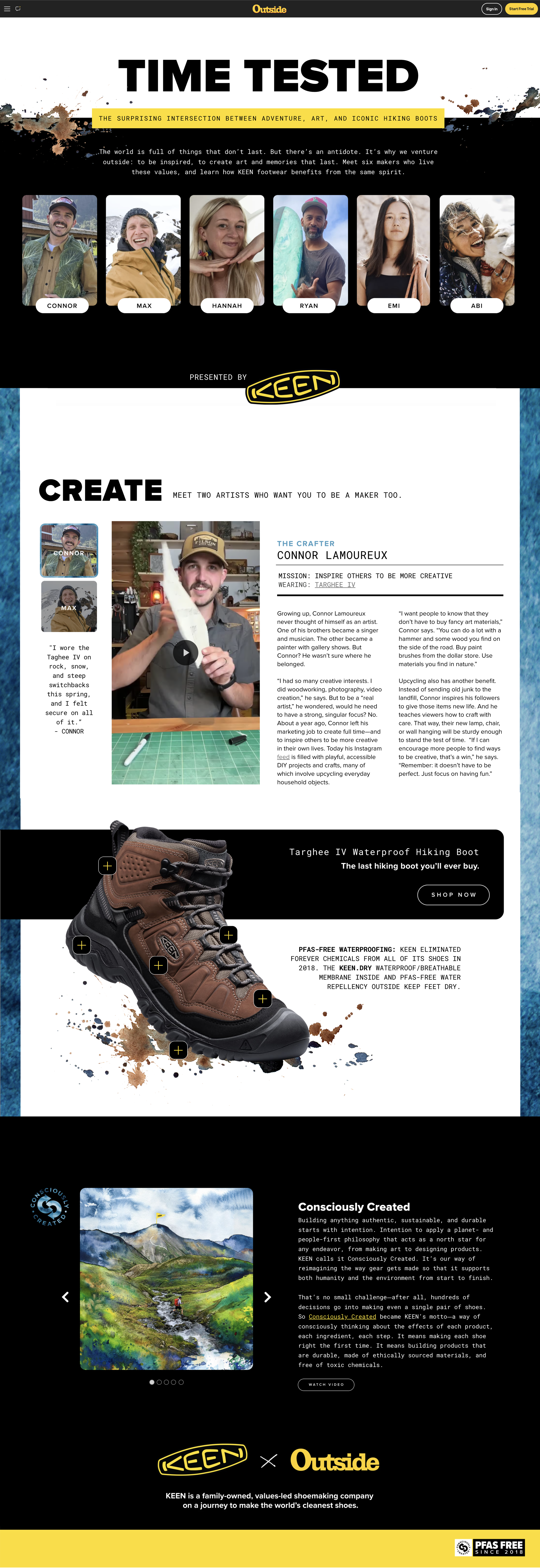 Goal: Create an immersive microsite to support KEEN Footwear’s Time Tested campaign, highlighting the brand’s sustainable design philosophy and fostering a connection with a community of nature-inspired creators.
